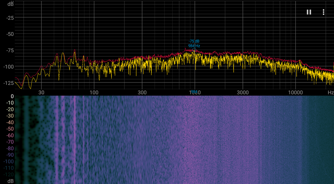 АЧХ розового шума показывает, что низких частот ожидаемо мало, но средние и высокие есть, также есть выраженные резонансные провалы и пики: