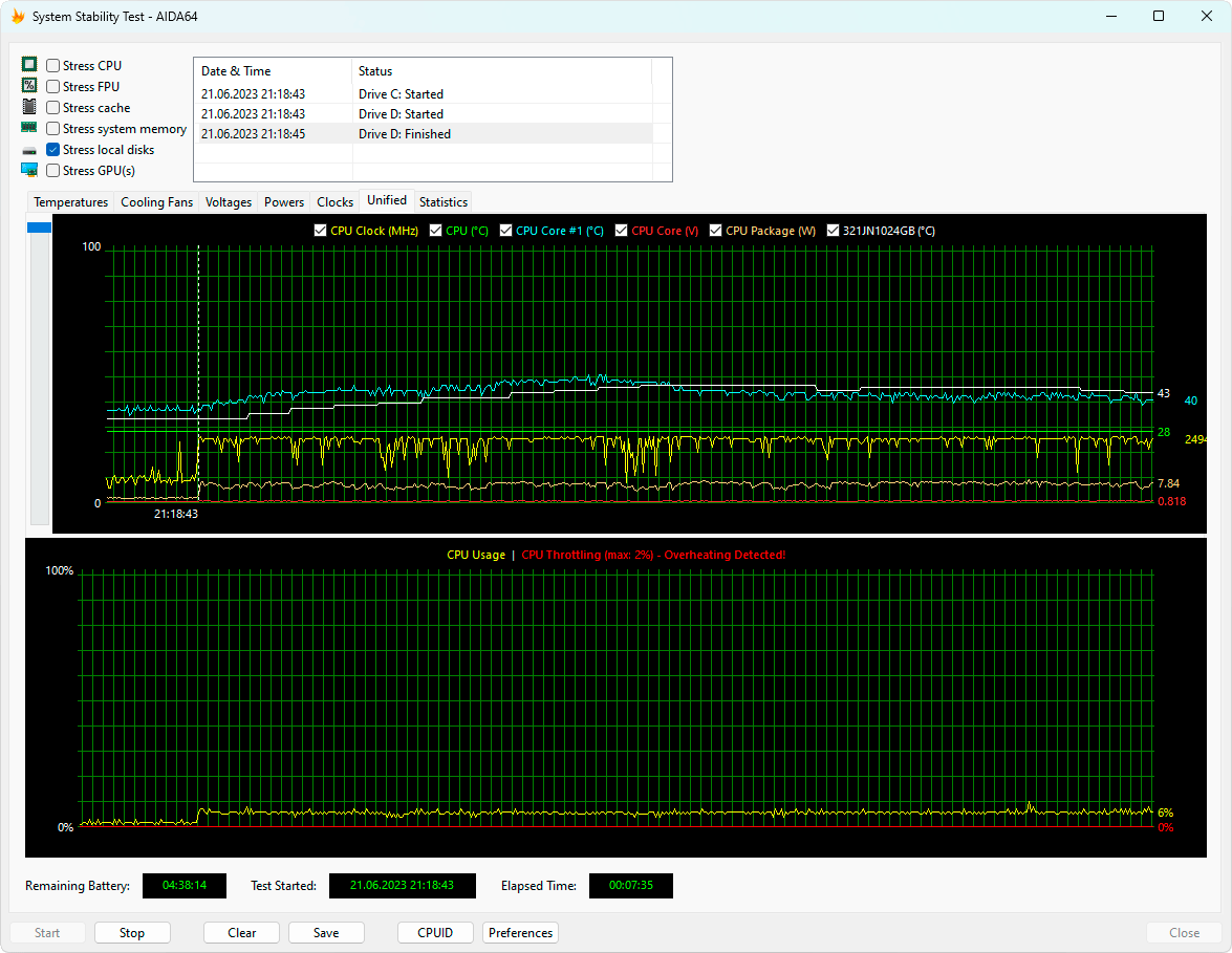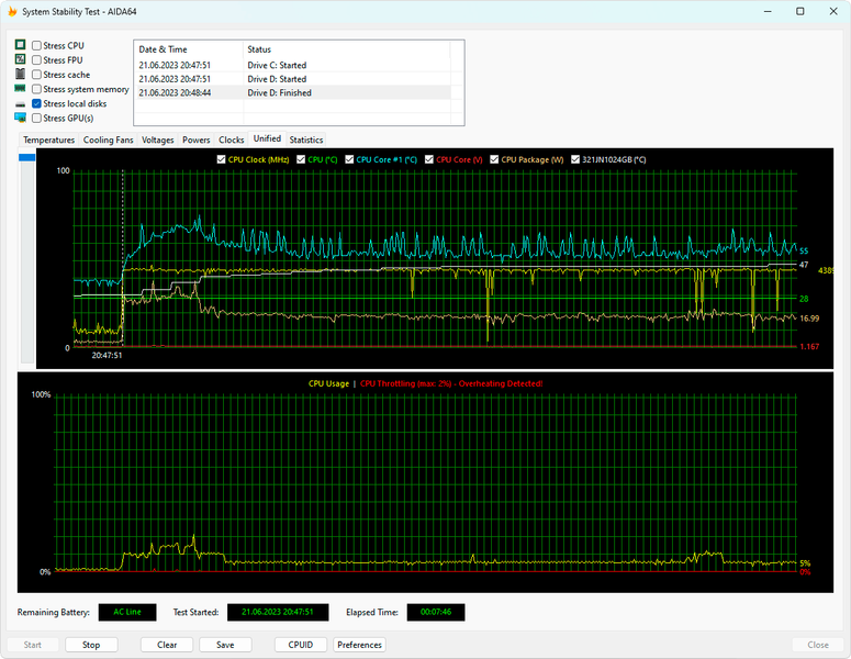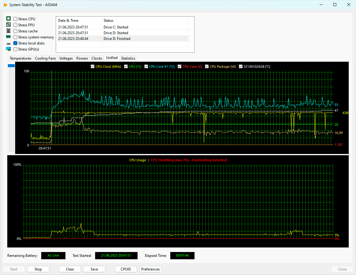 Несмотря на отсутствие теплораспределителя на SSD, его температурный режим работы вполне умеренный. Например, в стресс-тесте AIDA64 его удалось прогреть только до 47 °C при питании от электросети и до 44 °C при работе от аккумулятора.