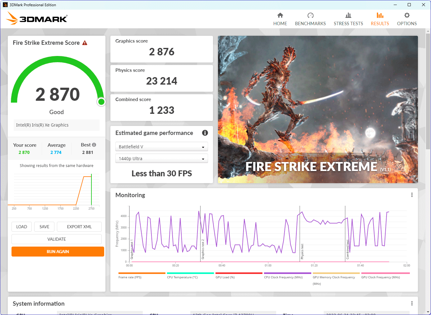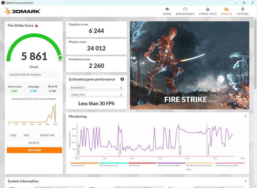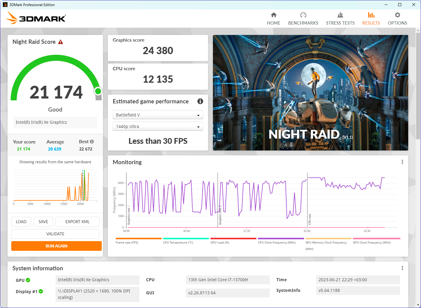 В самом начале теста частота производительных ядер процессора повышается до 4,5 ГГц, а энергоэффективных — до 3,2 ГГц, однако длится этот «праздник» совсем недолго, поскольку процессор перегревается и активируется тротлинг. Далее частота P-ядер сбрасывается до 2,8 ГГц, и в дело плавно вступает система охлаждения, вентиляторы которой удерживают температуры от повышения до критических границ. Стабилизация в производительном режиме происходит на частоте ядер 3,0 ГГц при энергопотреблении процессора 45 ватт и температурах 89—94 °C, а в сбалансированном режиме работы стабилизация происходит на частотах около 2,7 ГГц при 35 ваттах и температурах 77—81 °C. Уровень шума в обоих случаях умеренный, а без нагрузки ноутбук работает бесшумно.