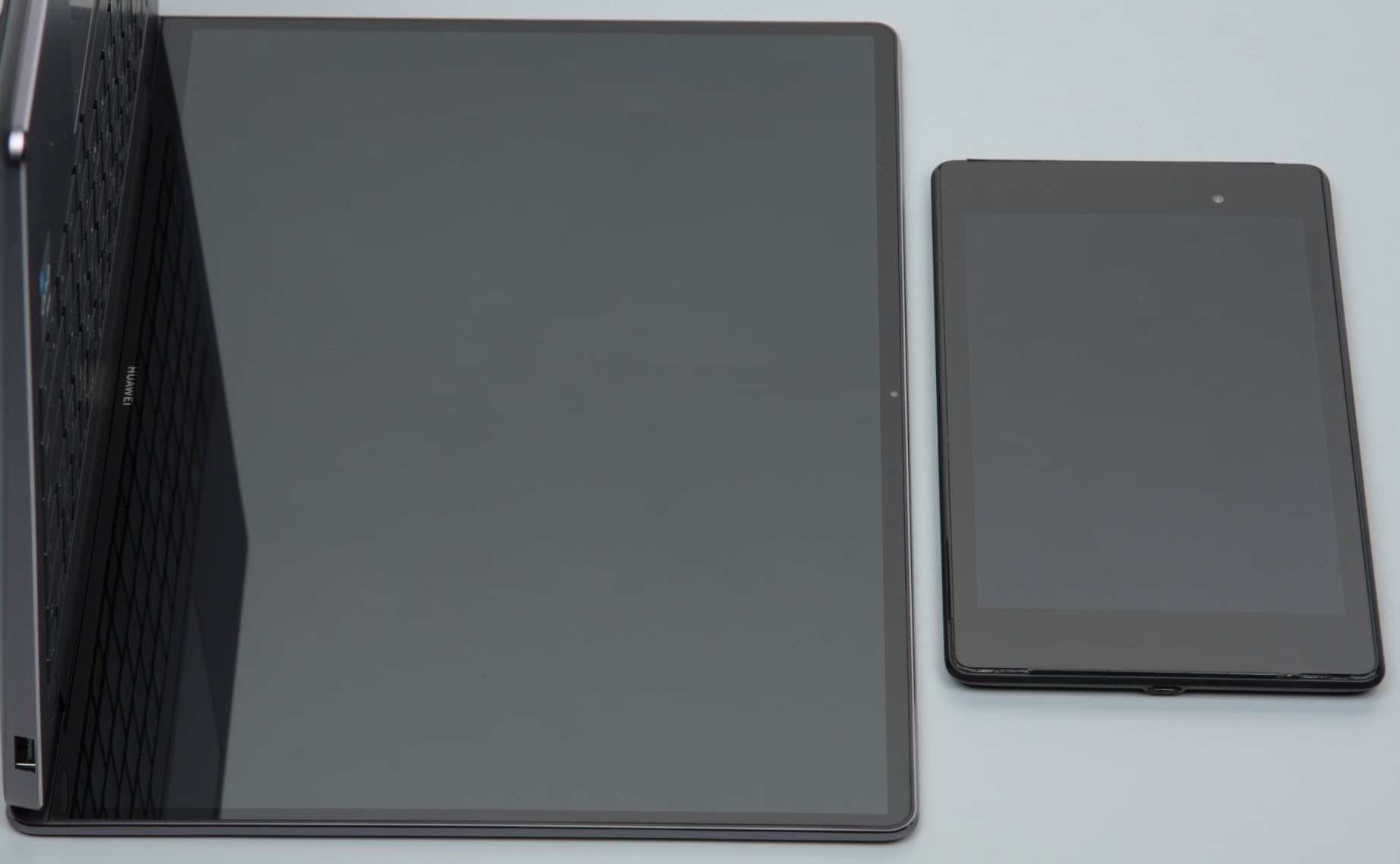 Лицевая поверхность экрана изготовлена из стеклянной пластины, устойчивой к появлению царапин. Экран снаружи зеркально-гладкий. На внешней поверхности экрана есть специальное олеофобное (жироотталкивающее) покрытие, которое по эффективности заметно лучше, чем у экрана планшета Google Nexus 7 (2013) (далее просто Nexus 7), поэтому следы от пальцев удаляются существенно легче, а появляются с меньшей скоростью, чем в случае обычного стекла. Экран сенсорный, датчик распознает до 10 прикосновений одновременно. Судя по яркости отраженных объектов, антибликовые свойства экрана не хуже, чем у Nexus 7. Для наглядности приведем фотографию, на которой в экранах обоих устройств отражается белая поверхность (где что — разобраться несложно):