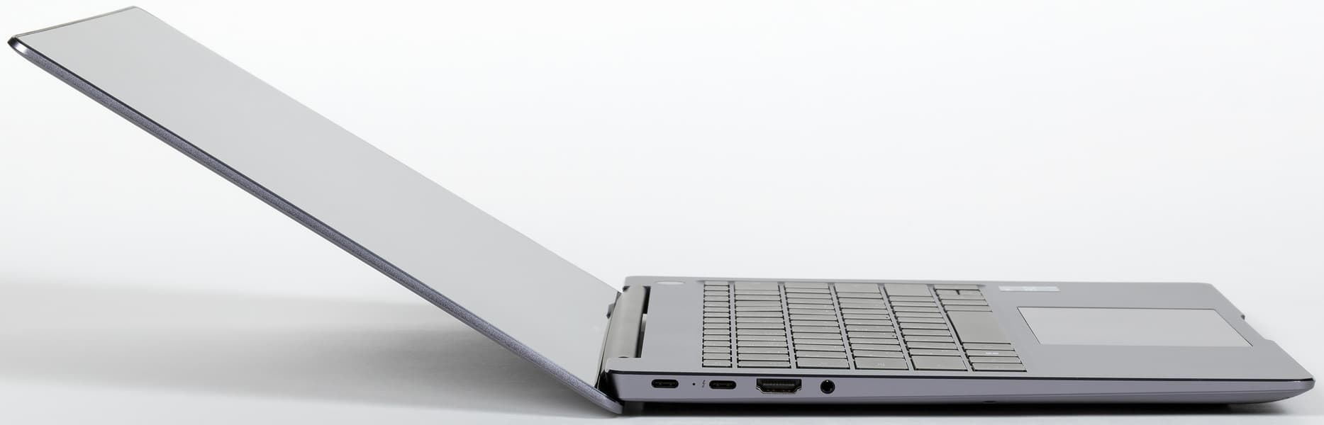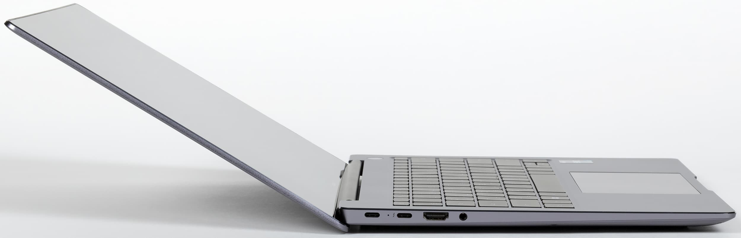 На левом торце корпуса ноутбука размещены один порт USB 3.2 Gen2 Type-C интерфейса Thunderbolt 4 с поддержкой зарядки и DisplayPort, второй «простой» USB Type-C также с поддержкой зарядки и DisplayPort, видеовыход HDMI 2.0 и универсальный миниджек для наушников/микрофона.