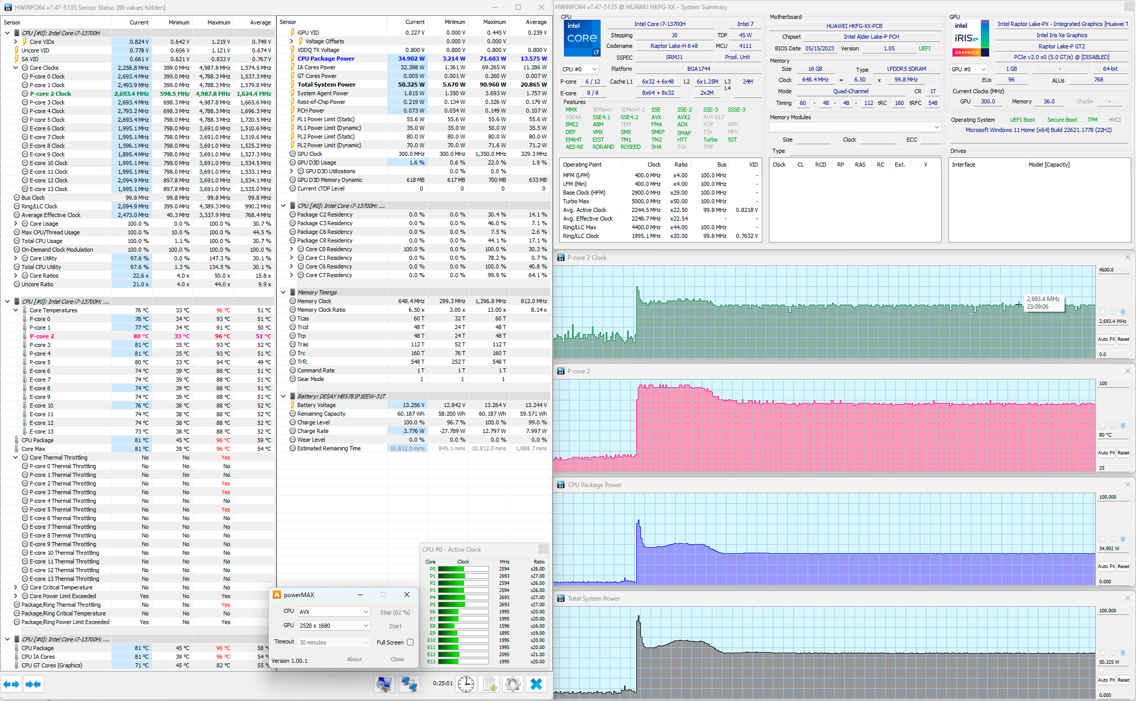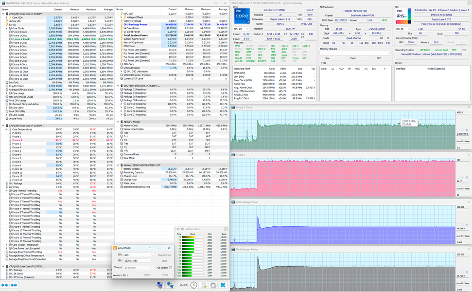 Мы протестировали оба режима Huawei MateBook 14s 2023 с помощью стресс-утилиты powerMax (с использованием AVX-инструкций), а мониторинг осуществлялся HWinfo64. Сначала посмотрим на работу ноутбука при его питании от электросети.