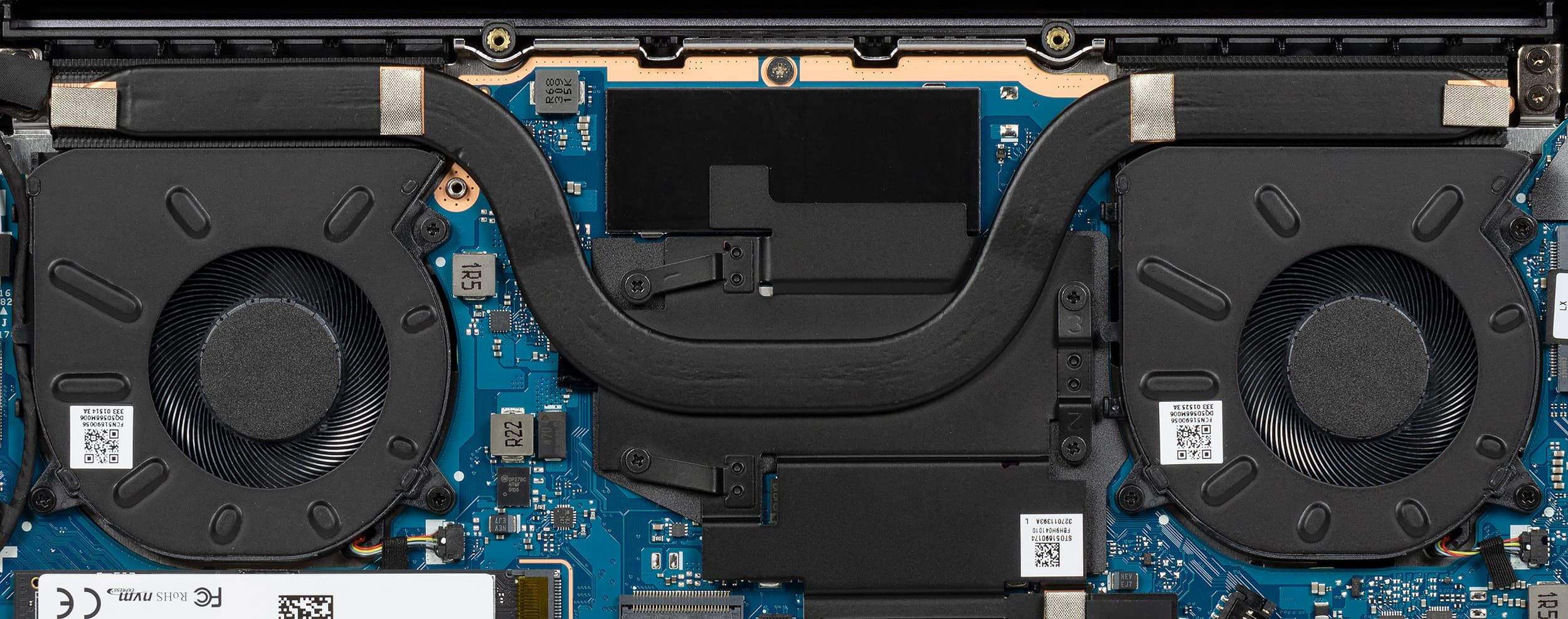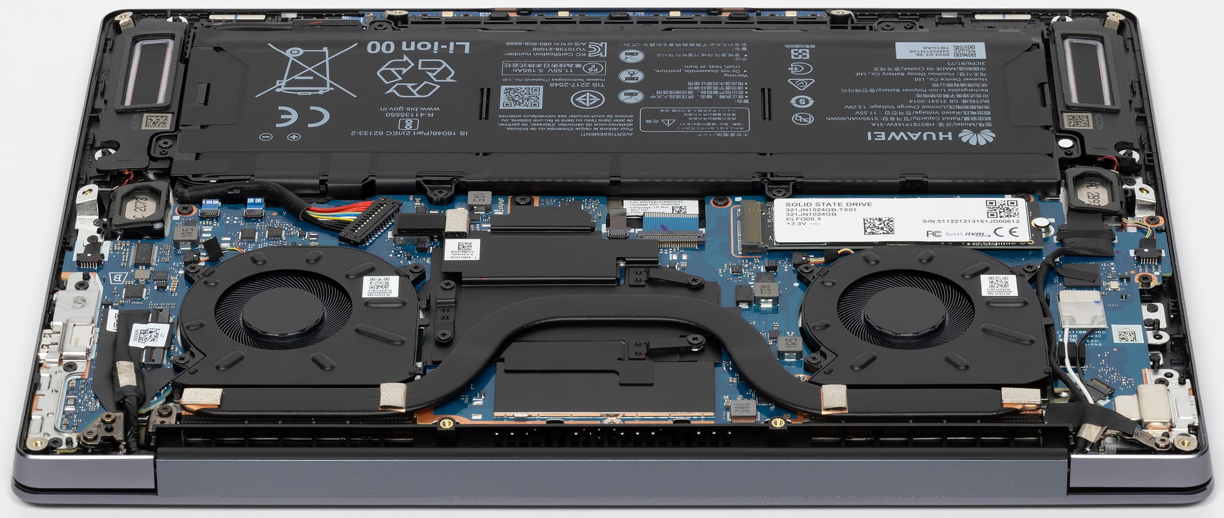 В системе охлаждения Huawei MateBook 14s 2023 используется теплораспределительная пластина с проходящей через нее 8-миллиметровой тепловой трубкой, два радиатора и два вентилятора с тончайшими лопастями Shark Fin.