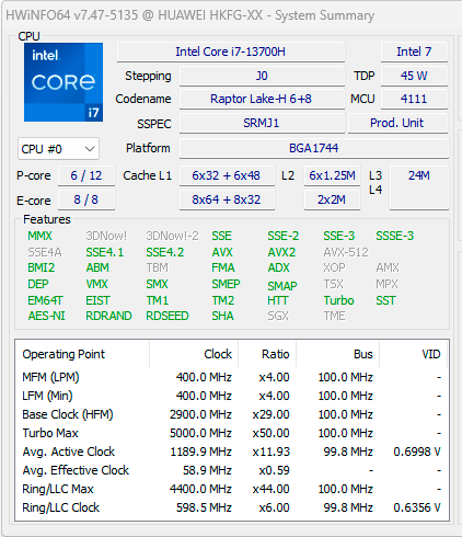 После стабилизации частота P-ядер составляет 2,6 ГГц при температурах 71—75 °C и энергопотреблении не выше 30 ватт. В этом случае система охлаждения ноутбука практически не слышна.