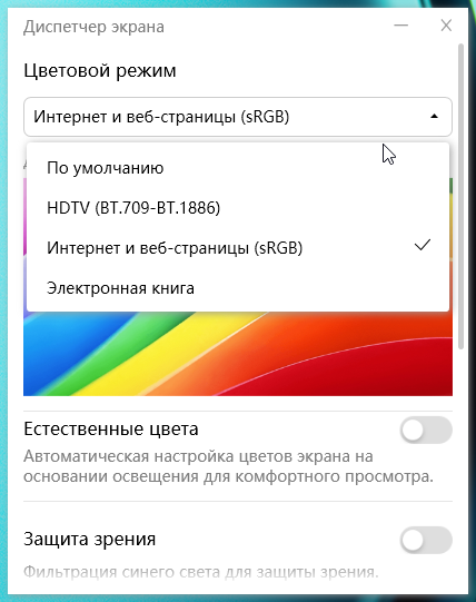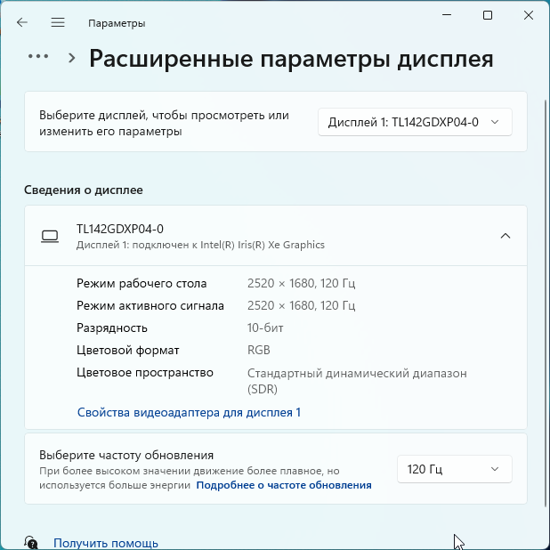 В настройках экрана на выбор доступны несколько частот обновления, от 24 до 120 Гц. По всей видимости, экран поддерживает все частоты в этом диапазоне. По крайней мере при родном разрешении экрана вывод идет с глубиной цвета до 10 бит на цвет, но использовать это преимущество вряд ли получится. Отметим, что частота обновления 120 Гц пригодится как при просмотре кинофильмов — тогда кадры будут выводиться с равной длительностью, а не с чередованием 2:3, — так и в играх.