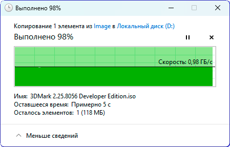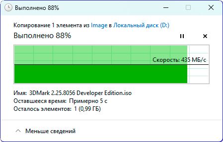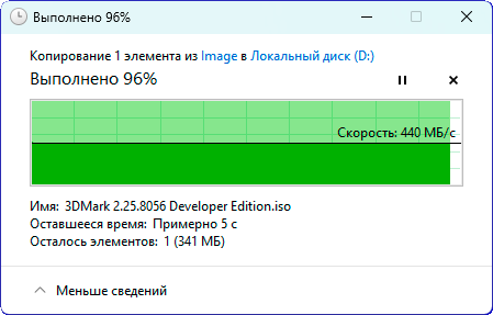 Пропускная способность порта Type-A и обычного Type-C одинакова и при копировании составляет примерно 440 МБ/с, тогда как через порт Type-C интерфейса Thunderbolt 4 файлы копируются со скоростью почти 1 ГБ/с.