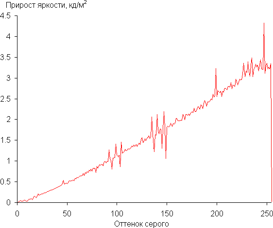 Далее мы измерили яркость 256 оттенков серого (от 0, 0, 0 до 255, 255, 255). График ниже показывает прирост (не абсолютное значение!) яркости между соседними полутонами: