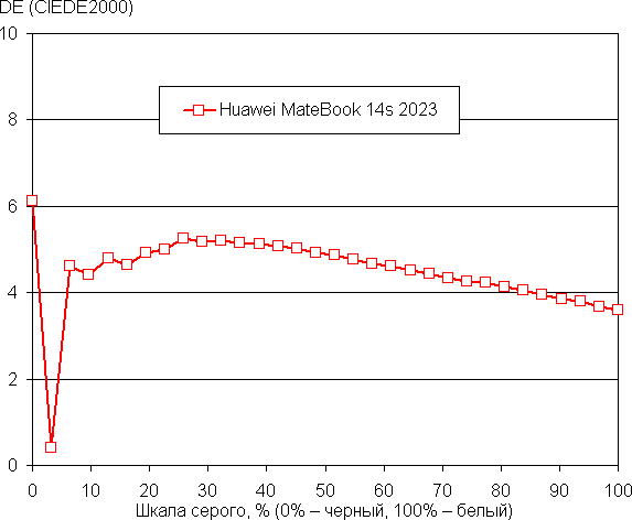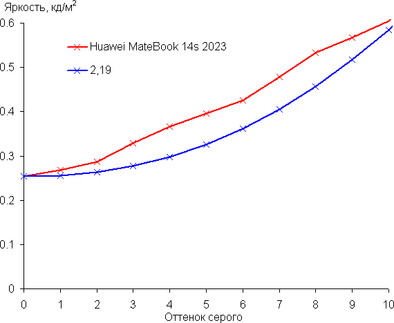 Рост прироста яркости на шкале серого в основном равномерный, и каждый следующий оттенок ярче предыдущего, за исключением одного самого светлого оттенка серого, который по яркости от белого не отличается. Впрочем, общей картины это не портит. В самой темной области визуально различаются все оттенки: