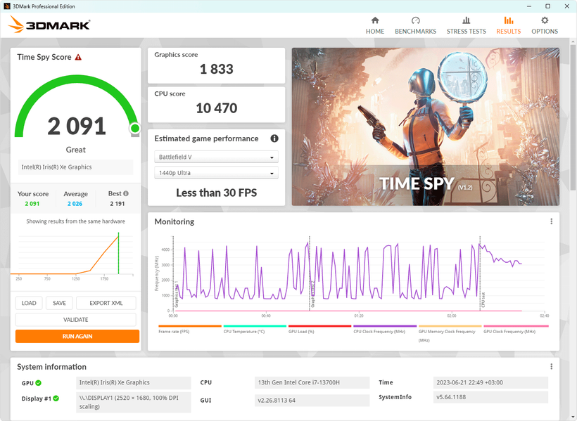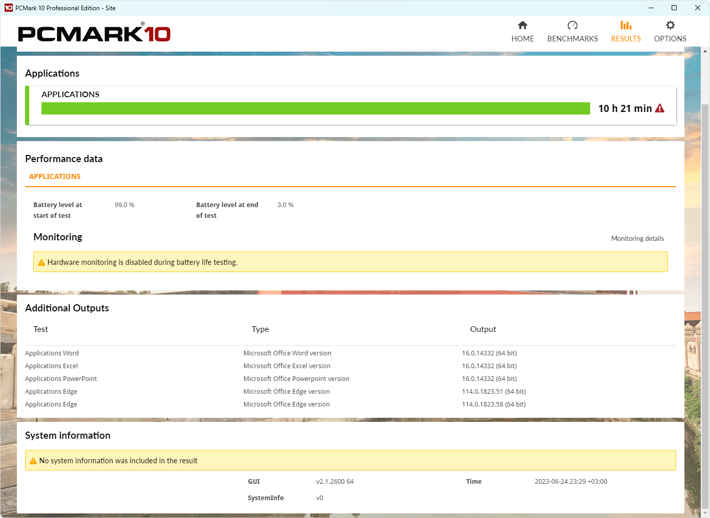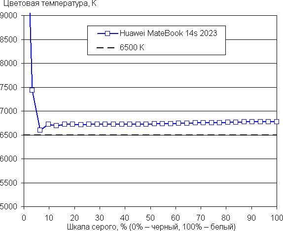 При питании от аккумулятора, когда доступен только режим Баланс, Huawei MateBook 14s 2023 демонстрирует чуть более умеренные показатели, чем при питании от электросети.