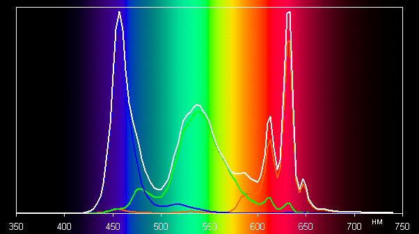 Поэтому визуально цвета изображений, ориентированных на вывод в пространстве sRGB, на этом экране имеют естественную насыщенность. Ниже приведен спектр для белого поля (белая линия), наложенный на спектры красного, зеленого и синего полей (линии соответствующих цветов):