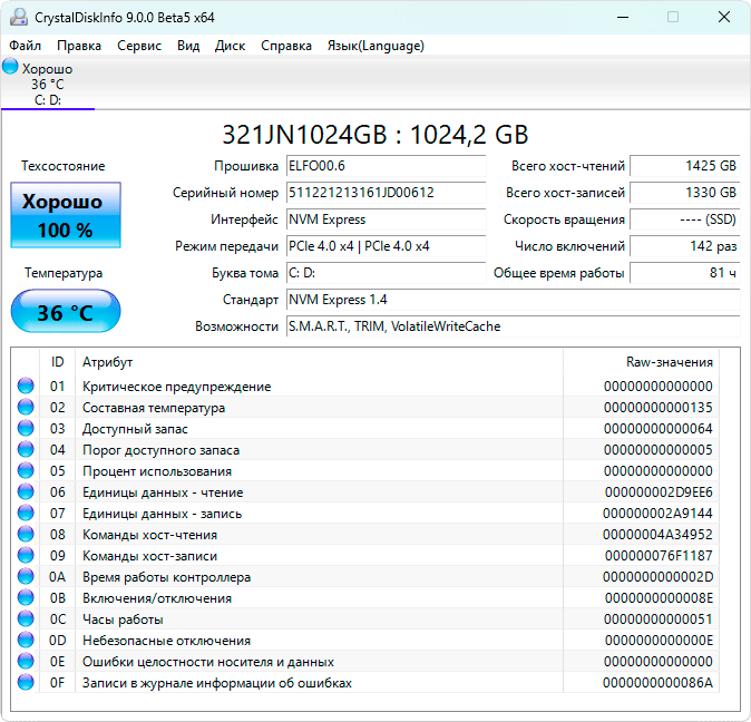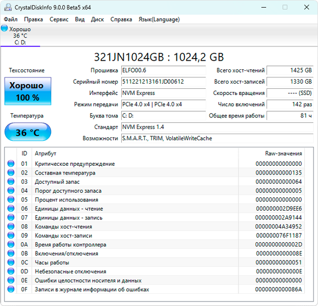 Отличие от накопителя Huawei MateBook 14s 2022 в том, что здесь он поддерживает интерфейс NVMe версии 1.4 и PCIe 4.0, что нам подтверждает CrystalDiskInfo.