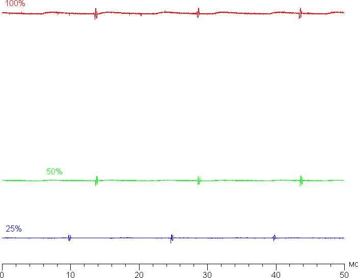 На любом уровне яркости значимая модуляция подсветки отсутствует, поэтому нет и никакого мерцания экрана. В доказательство приведем графики зависимости яркости (вертикальная ось) от времени (горизонтальная ось) при различных значениях настройки яркости: