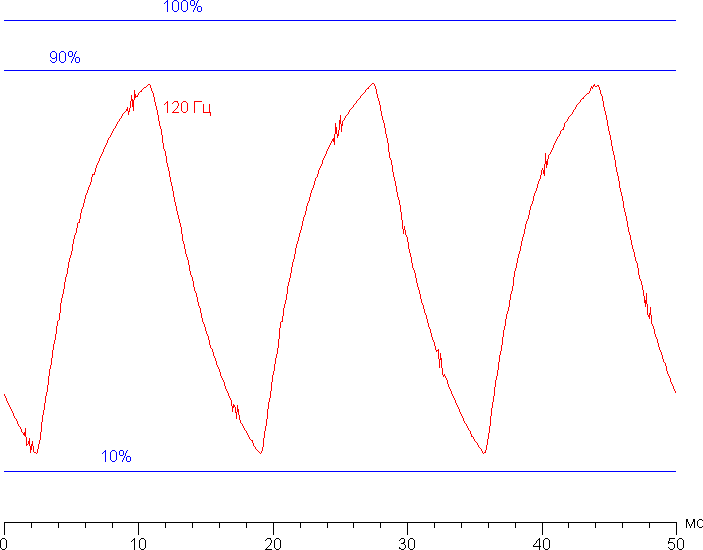 Видно, что при 120 Гц максимальная яркость белого кадра ниже 90% от уровня белого, а минимальная яркость черного кадра выше 10%. Итоговый размах амплитуды меньше 80% от яркости белого. То есть согласно этому формальному критерию скорости матрицы недостаточно для полноценного вывода изображения с кадровой частотой 120 Гц.