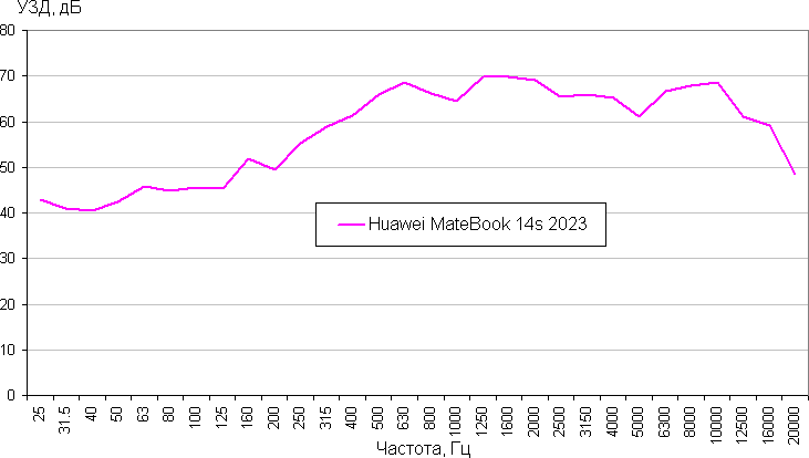 Если ноутбук не нагружать совсем, то его система охлаждения в случае профиля Баланс и в указанных выше условиях может работать в пассивном режиме. В этом же профиле даже при большой нагрузке шум от системы охлаждения умеренный. Включение профиля производительность повышает как одноименную характеристику, так и уровень шума. В любом случае характер шума ровный и раздражения не вызывает. Спектрограмма, полученная для максимальной скорости вентиляторов, достаточно ровная, и в диапазоне частот, где звуки могут вызывать особенное раздражение, выраженных пиков нет: