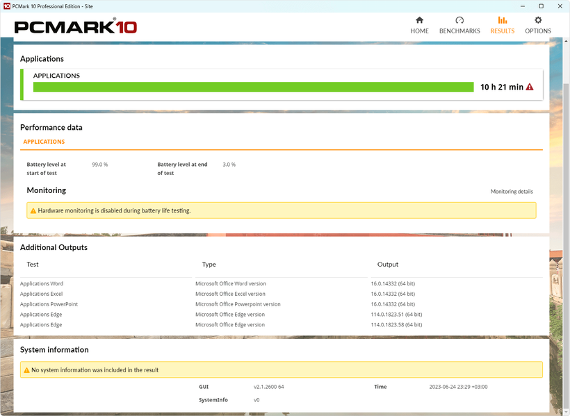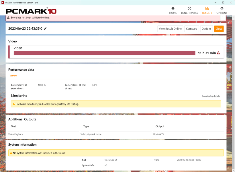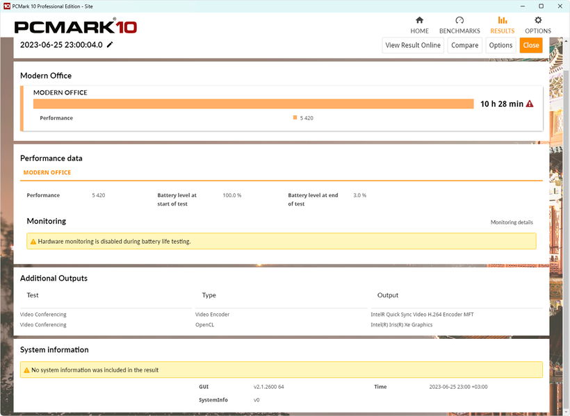 Мы провели тестирование автономности ноутбука по нашей методике с использованием скрипта iXBT Battery Benchmark v1.0. Яркость экрана при тестировании выставляется на 100 кд/м² (в данном случае это соответствует примерно 40%), так что ноутбуки с относительно тусклыми экранами не получают преимущества.