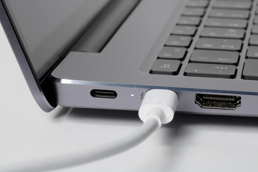 Восполнение заряда аккумулятора происходит через разъем USB Type-C, соединяемый с адаптером кабелем длиной 1,77 м. При подключении адаптера к электросети на корпусе ультрабука загорается белый светодиод.