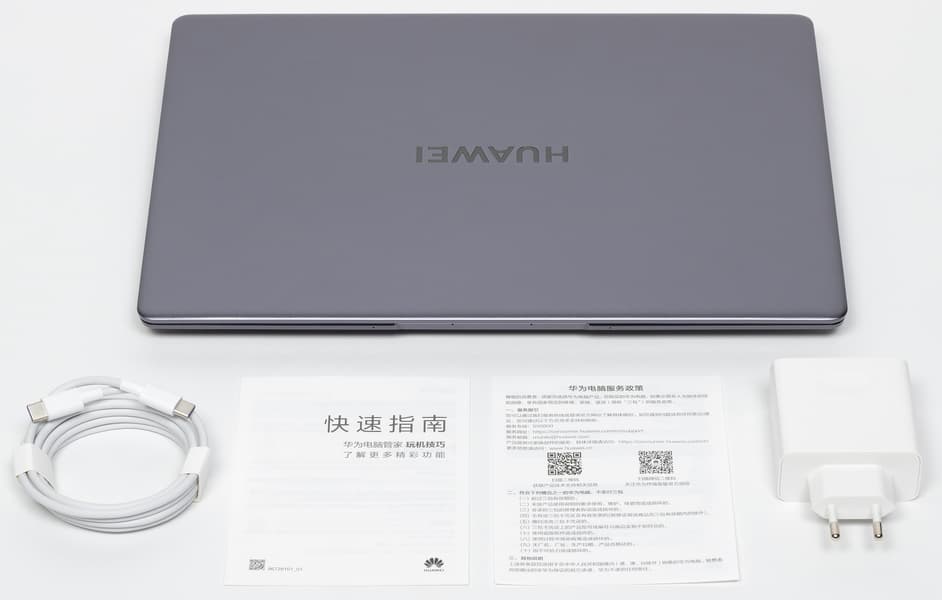 Комплектация у Huawei, как всегда, предельно лаконична, и кроме самого ноутбука включает адаптер питания с кабелем, гарантийную памятку и краткую инструкцию.