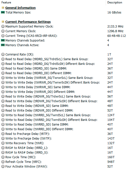 | Оперативная память | 16 (4×4) ГБ LPDDR5-4266 (распаяна на плате), четырехканальный режим (соответствует двухканальному режиму DDR4), тайминги 60-48-48-112 CR1 | |
