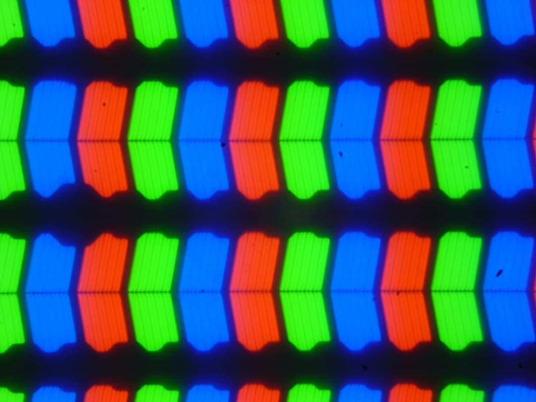 В этом ноутбуке используется матрица типа IPS. Микрофотографии демонстрируют типичную для IPS структуру субпикселей (черные точки — это пыль на матрице фотоаппарата):