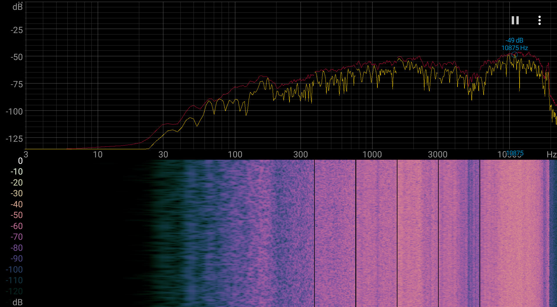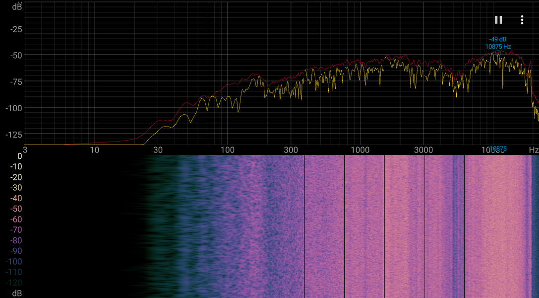 Измерение громкости встроенных громкоговорителей проводилось при воспроизведении звукового файла с розовым шумом. Максимальная громкость оказалась равна 79,0 дБА. Среди ноутбуков, протестированных к моменту написания данной статьи, этот ноутбук заметно громче среднего по громкости (74,0 дБА). Спектрограмма белого шума показывает, что выраженных резонансных пиков нет, низких частот нет, а в области между средними и высокими частотами есть провал: