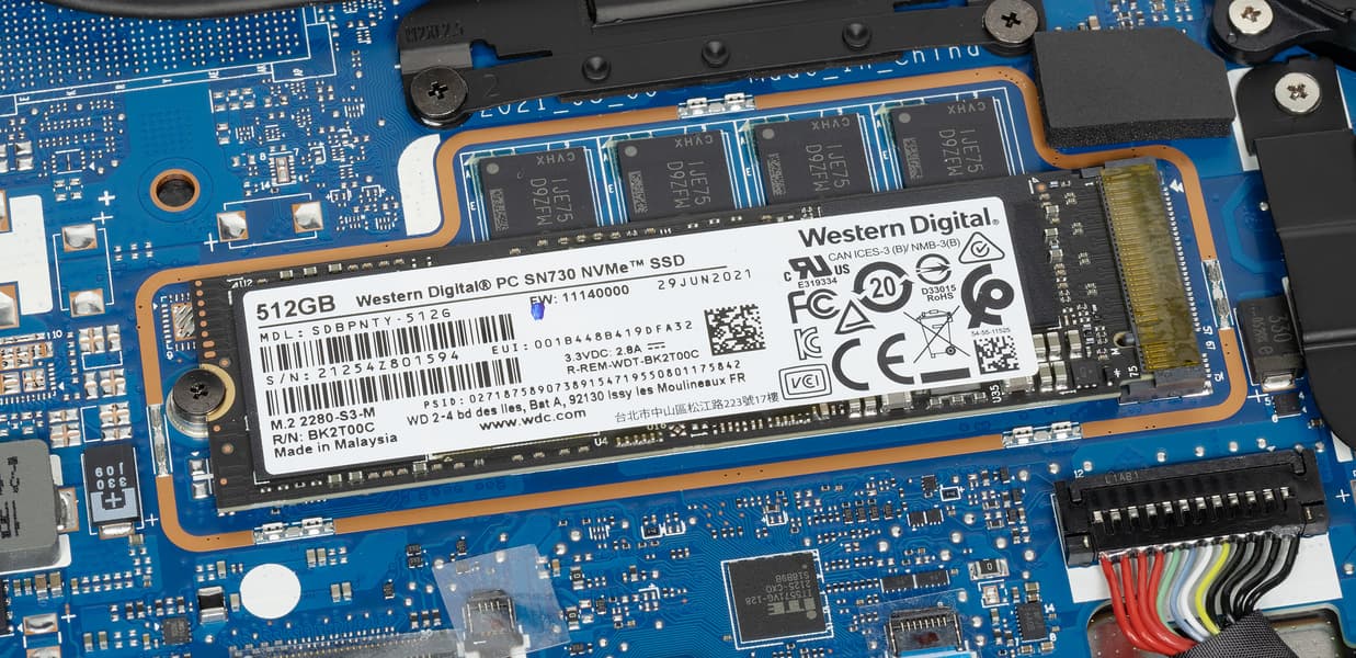 На материнской плате ноутбука присутствует один слот M.2, расположенный прямо у чипов оперативной памяти. В него установлен SSD объемом 512 ГБ производства Western Digital модели SN730 (SDBPNTY-5126). Конструктивно он устанавливается в слот таким образом, что накрывает микросхемы оперативной памяти.