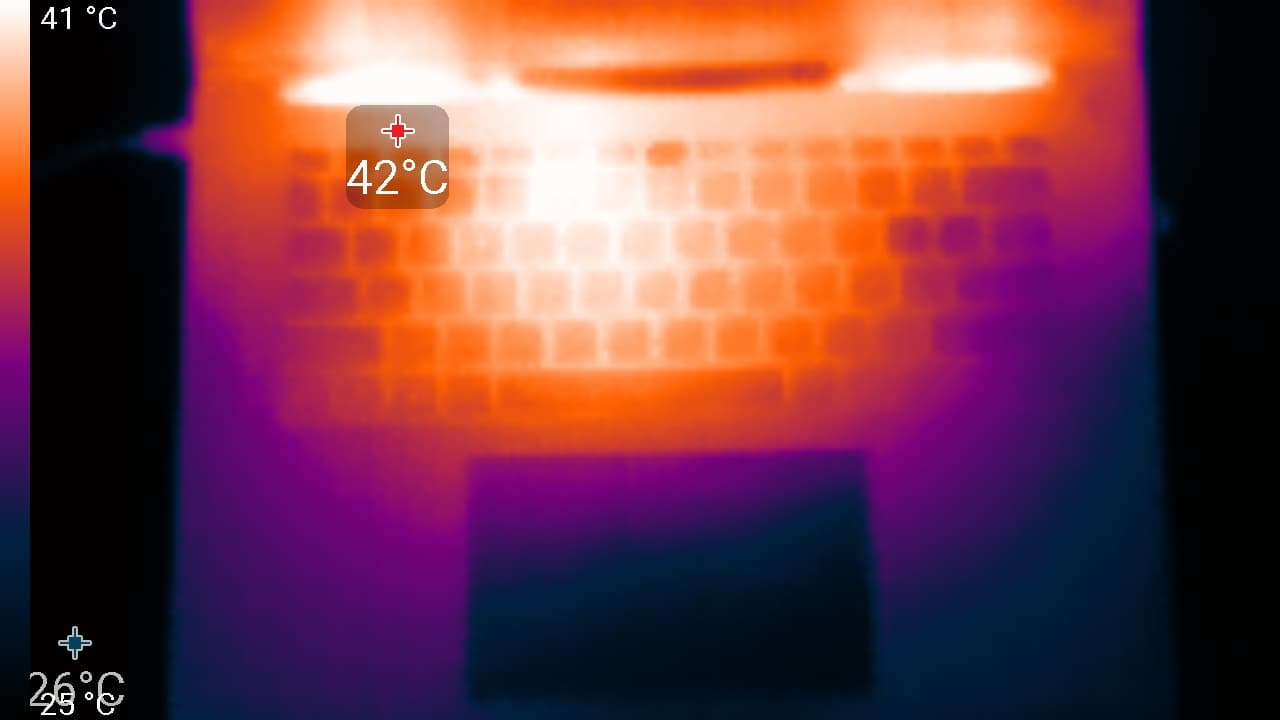 Под максимальной нагрузкой работать с клавиатурой комфортно, так как места под запястьями практически не нагреваются. Держать ноутбук на коленях при этом неприятно, поскольку колени частично соприкасаются с областями высокого нагрева. Также колени перекрывают вентиляционные решетки, что увеличивает шум и может вызвать перегрев ноутбука. Блок питания греется очень сильно, поэтому необходимо следить, чтобы при долговременной работе с высокой производительностью он не был ничем накрыт.