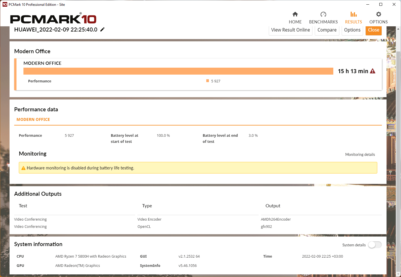 Тесты автономности были проведены при яркости экрана 100 кд/м² (35% по шкале яркости) в пакете PCMark’10 при активных сетевых соединениях и громкости звука 20%. Их результаты приведены далее на скриншотах.