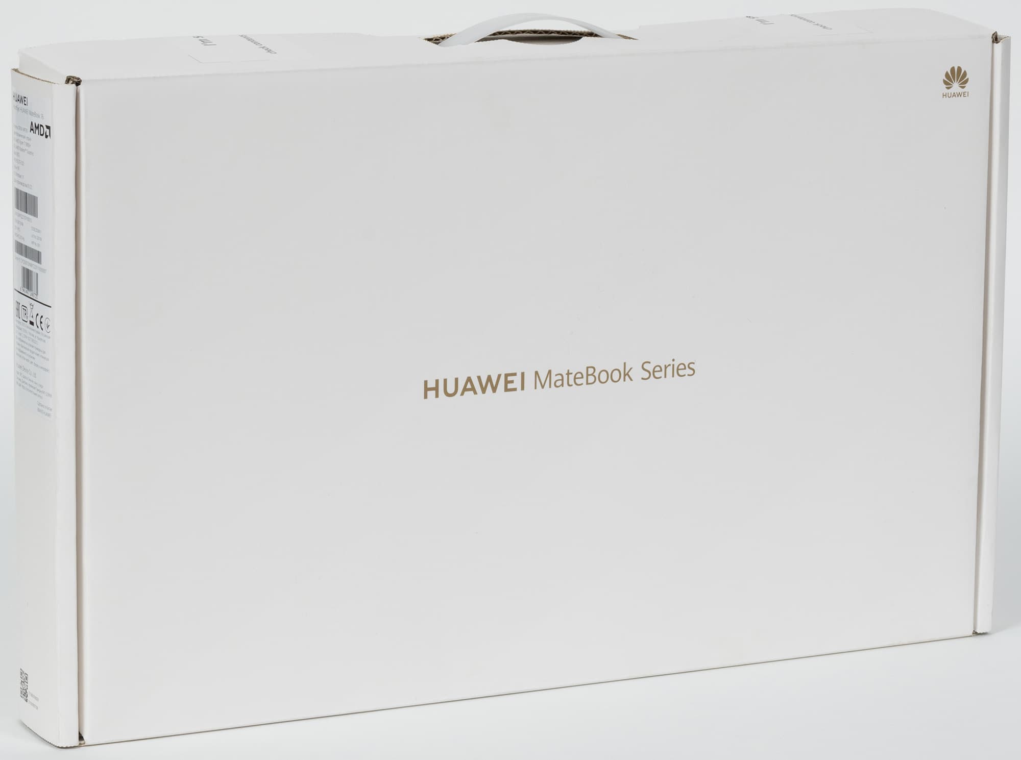 Ноутбук запечатан в белую коробку с золотистой надписью в центре. Коробка имеет пластиковую ручку для переноски, а с ее торца приклеена наклейка с информацией о модели и штрих-кодами.