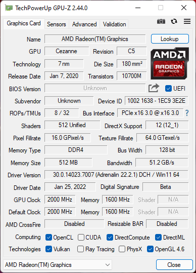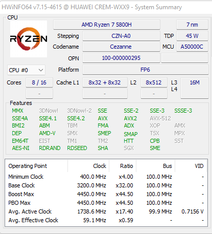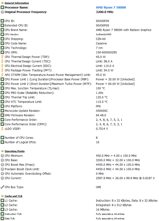 | Центральный процессор | AMD Ryzen 7 5800H (Cezanne, 7 нм FinFET, 8 ядер/16 потоков, 3,2—4,4 ГГц, L3-кэш 16 МБ, TDP 35—54 Вт) | |