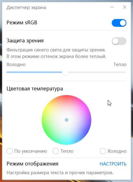 По умолчанию в настройках экрана включен профиль sRGB. Если его выключить, то цветовой охват не меняется, но цветовая температура немного повышается (графики выше с подписью Исходн.). При этом цветовой баланс можно подправить, двигая точку на цветовом круге или выбирая предустановленные профили коррекции, но надобности в этом нет, достаточно оставить включенным по умолчанию профиль sRGB.