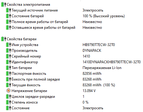 По данным AIDA64 Extreme, емкость аккумулятора при полной зарядке составляет 83,3 Вт·ч, что практически соответствует паспортному значению.