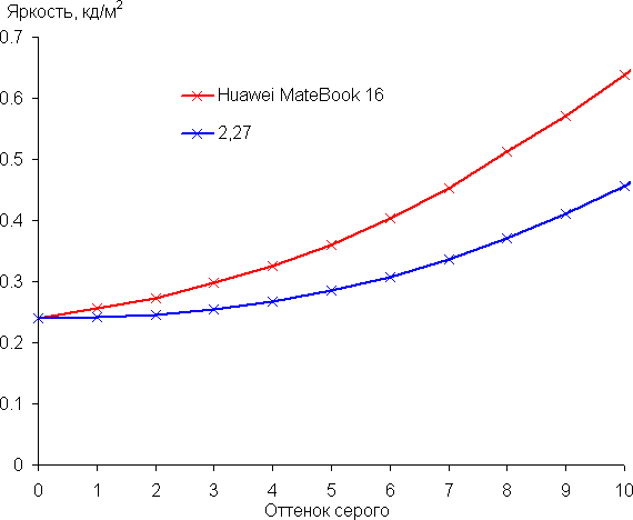 Далее мы измерили яркость 256 оттенков серого (от 0, 0, 0 до 255, 255, 255). График ниже показывает прирост (не абсолютное значение!) яркости между соседними полутонами: