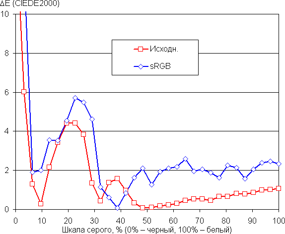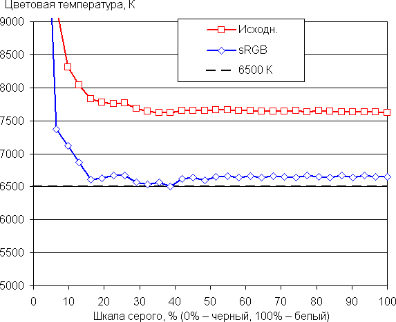 По умолчанию баланс оттенков на шкале серого хороший (графики sRGB на рисунках ниже), так как цветовая температура близка к стандартным 6500 К, и отклонение от спектра абсолютно черного тела (ΔE) ниже 10, что для потребительского устройства считается приемлемым показателем. При этом цветовая температура мало изменяется от оттенка к оттенку — это положительно сказывается на визуальной оценке цветового баланса. (Самые темные области шкалы серого можно не учитывать, так как там баланс цветов не имеет большого значения, да и погрешность измерений цветовых характеристик на низкой яркости большая.)