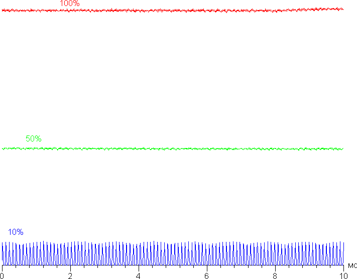 При сильном снижении яркости от максимальной появляется модуляция подсветки, но ее частота очень высокая (порядка 10 кГц), поэтому никакого видимого глазом мерцания экрана нет, не выявляется оно и в тесте на стробоскопический эффект. Приведем графики зависимости яркости (вертикальная ось) от времени (горизонтальная ось) при различных значениях настройки яркости: