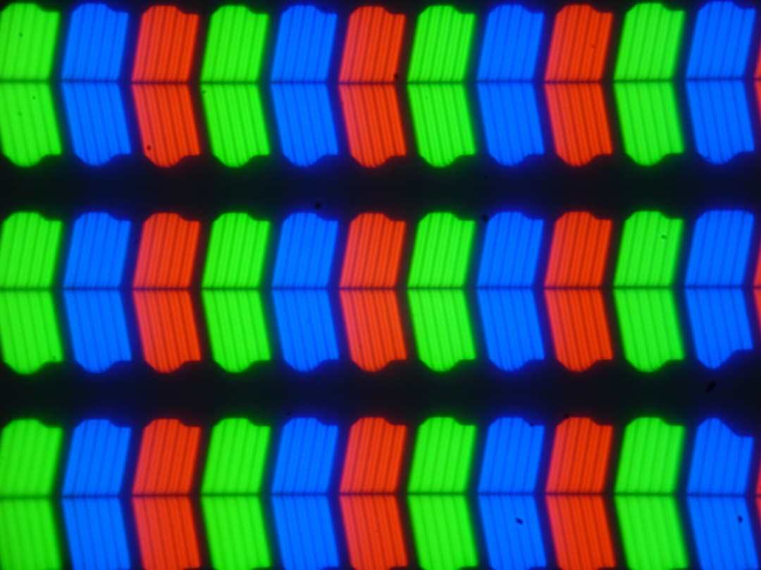 В этом ноутбуке используется матрица типа IPS. Микрофотографии демонстрируют типичную для IPS структуру субпикселей (черные точки — это пыль на матрице фотоаппарата):