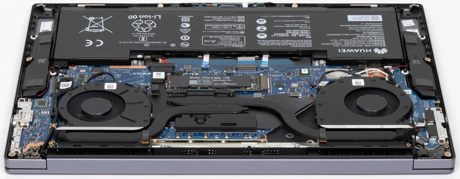 Поскольку теперь у Huawei MateBook 16s более производительная аппаратная платформа, то разработчикам потребовалось повысить эффективность системы охлаждения. Сделано это за счет замены двух сквозных 6-миллиметровых тепловых трубок на две индивидуальные 8-миллиметровые.