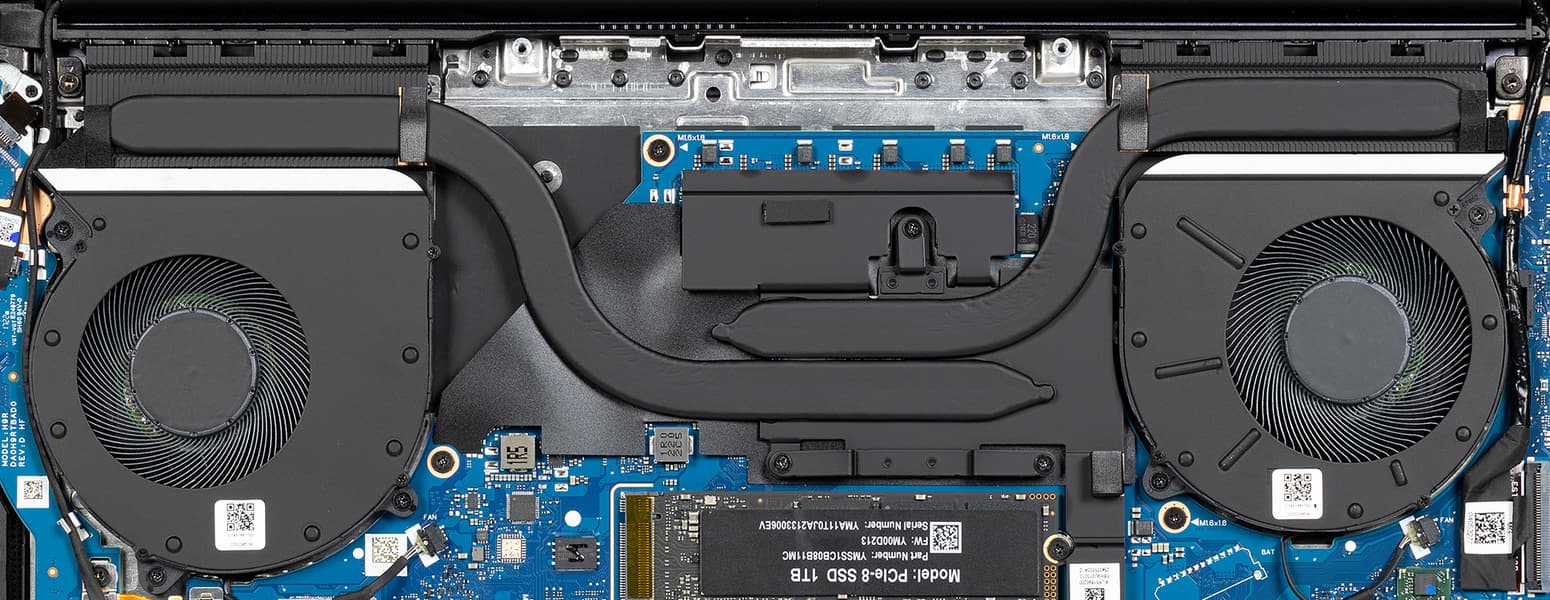 Также похоже, что увеличены крыльчатки вентиляторов с лопастями Shark Fin. А вот принципиально работа системы охлаждения не изменилась: холодный воздух засасывается снизу и по центру заднего торца, а нагретый выбрасывается назад через медные ребра радиаторов.