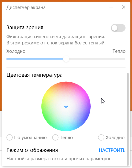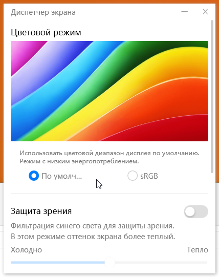 Если в настройках экрана включить профиль sRGB, то цветовой охват практически не меняется, но цветовая температура становится ближе к 6500 К и ΔE в светлой области снижается (графики выше с подписью sRGB). Но разброс ΔE увеличивается, а максимальная яркость и контраст снижаются. Особого смысла включать этот профиль нет. Также в теории цветовой баланс можно подправить, двигая точку на цветовом круге или выбирая предустановленные профили коррекции, но любое вмешательство (включение опции Защита зрения тоже) приводит к аномальному изменению гамма-кривой, вернуть в норму ее помогает только удаление графического драйвера и установка его обратно.