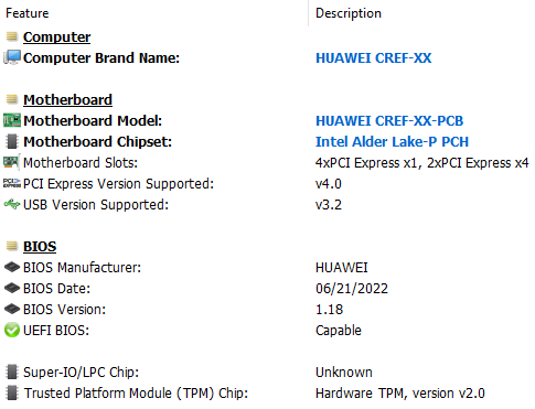| Прочие особенности | алюминиевый корпус; встроенный датчик Huawei Share (NFC); производительный режим работы; кнопка питания со встроенным сканером отпечатков пальцев; Huawei PC Manager, Display Manager (Eye Comfort Mode) | |