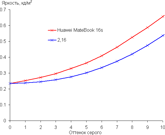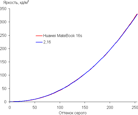 Аппроксимация полученной гамма-кривой дала показатель 2,16, что немного ниже стандартного значения 2,2, при этом реальная гамма-кривая мало отклоняется от аппроксимирующей степенной функции: