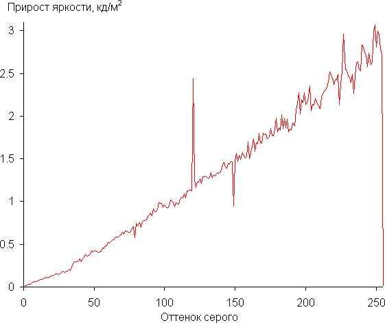 Далее мы измерили яркость 256 оттенков серого (от 0, 0, 0 до 255, 255, 255). График ниже показывает прирост (не абсолютное значение!) яркости между соседними полутонами:
