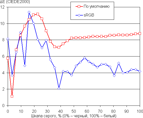 По умолчанию баланс оттенков на шкале серого приемлемый, так как цветовая температура достаточно близка к стандартным 6500 К, и отклонение от спектра абсолютно черного тела (ΔE) только на участке в темной области немного выше 10, что для потребительского устройства можно простить. При этом цветовая температура и ΔE мало изменяются от оттенка к оттенку — это положительно сказывается на визуальной оценке цветового баланса. (Самые темные области шкалы серого можно не учитывать, так как там баланс цветов не имеет большого значения, да и погрешность измерений цветовых характеристик на низкой яркости большая.)