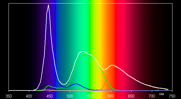 Такой спектр с относительно узким пиком синего и с широкими горбами зеленого и красного цветов характерен для экранов, в которых используется белая светодиодная подсветка с синим излучателем и желтым люминофором.