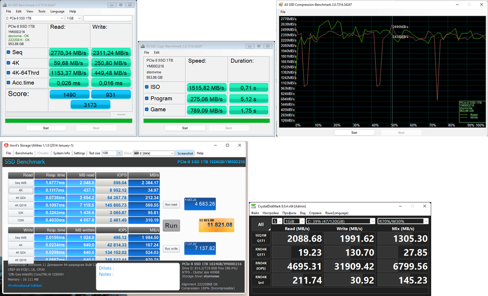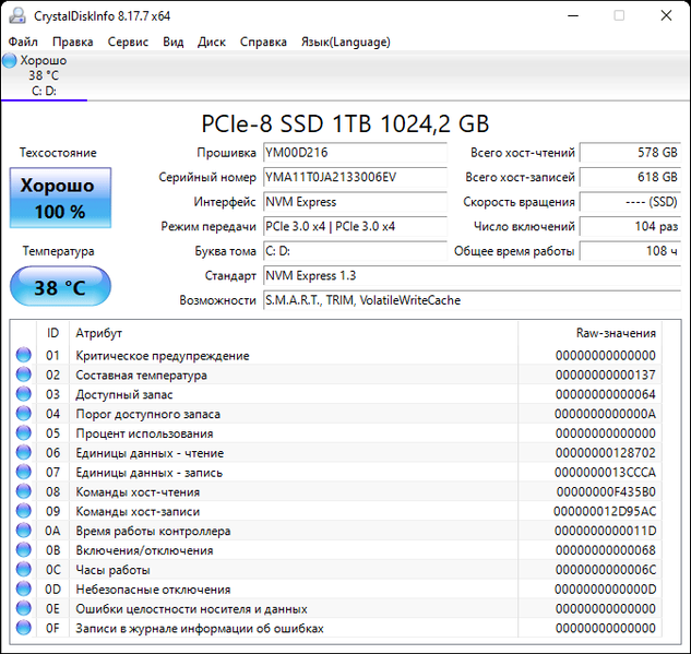 | Накопитель | 1×SSD 1 ТБ PCIe-8 (YM00D216), M.2 2280, NVMe, PCIe 3.0 x4 | |