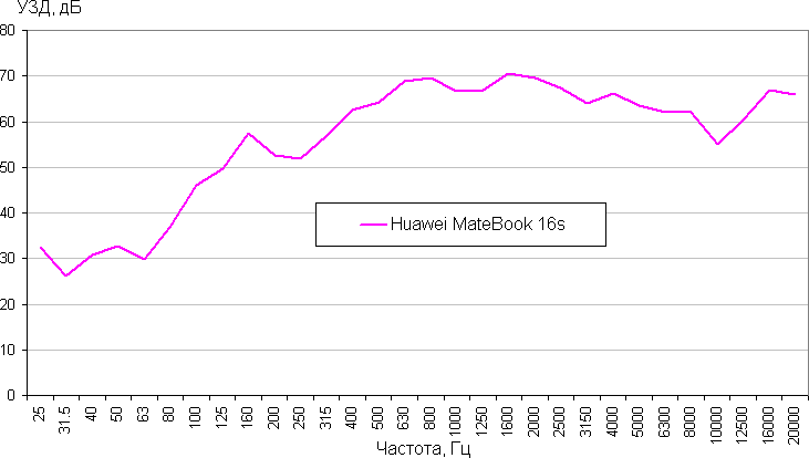Если ноутбук не нагружать совсем, то его система охлаждения в случае профиля Баланс может работать в пассивном режиме. В этом профиле даже при большой нагрузке шум от системы охлаждения очень умеренный. Включение профиля Производительность повышает как одноименную характеристику, так и уровень шума. В любом случае характер шума ровный и раздражения не вызывает. Спектрограмма, полученная для максимальной скорости вентиляторов, достаточно ровная, и в диапазоне частот, где звуки могут вызывать особенное раздражение, выраженных пиков нет: