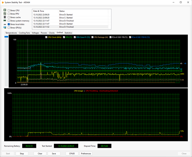 Сразу можно отметить, что графики мониторинга более равномерные, перепады частот/температур/энергопотребления не такие сильные, как при питании от электросети. Частоты P-ядер стабилизируются на уровне 1,8-1,9 ГГц при энергопотреблении от 25 до 48 ватт и температуре 76 °C. Уровень шума в этом случае заметно ниже, но и при работе от электросети ноутбук является шумным только в стресс-тестах, а в обычной работе даже с ресурсоемкими приложениями акустический комфорт сохраняется.
