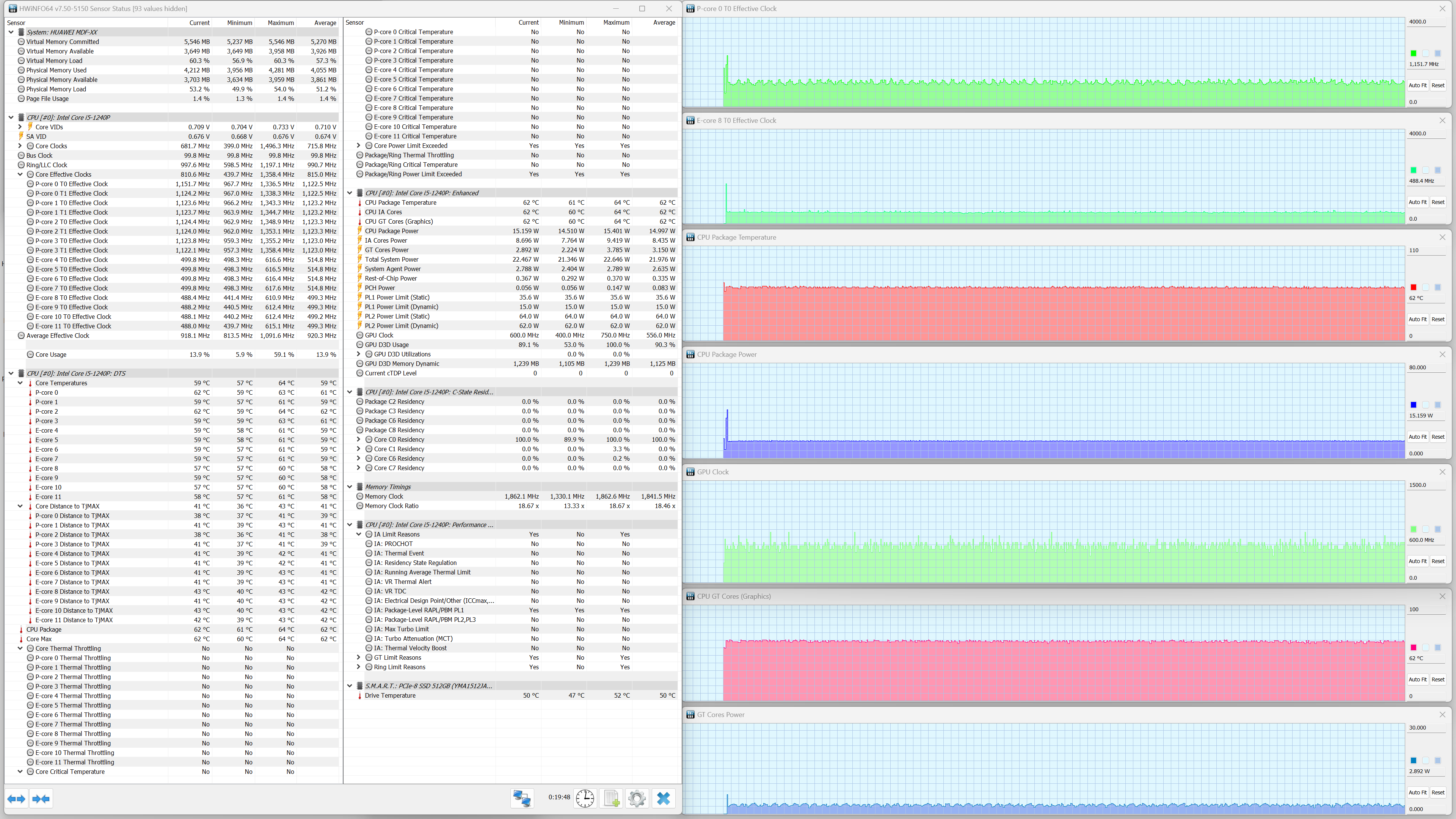 В ноутбуке Huawei MateBook D 14 2023 установлен мобильный процессор Intel Core i5-1240P. В соответствии с термопакетом, его тепловыделение в стабильном режиме составляет до 28 Вт, а при разгоне — до 64 Вт. В ходе наших испытаний под максимальной нагрузкой CPU в турборежиме отбирал 64 Вт мощности, что точно соответствует паспортному значению, а при стабильной работе — 30 Вт, что даже немного выше предписаний.