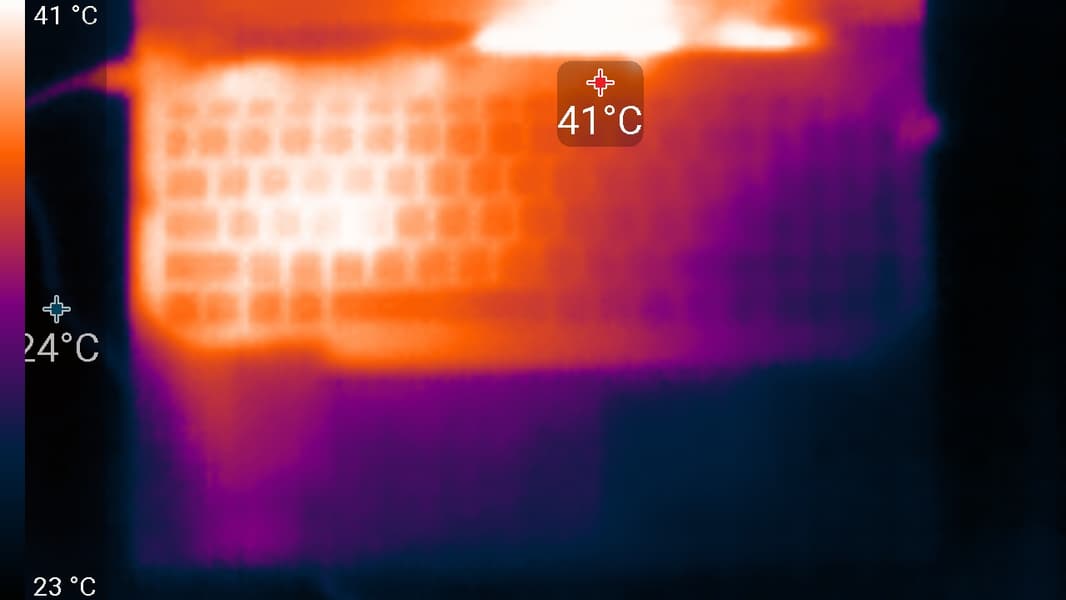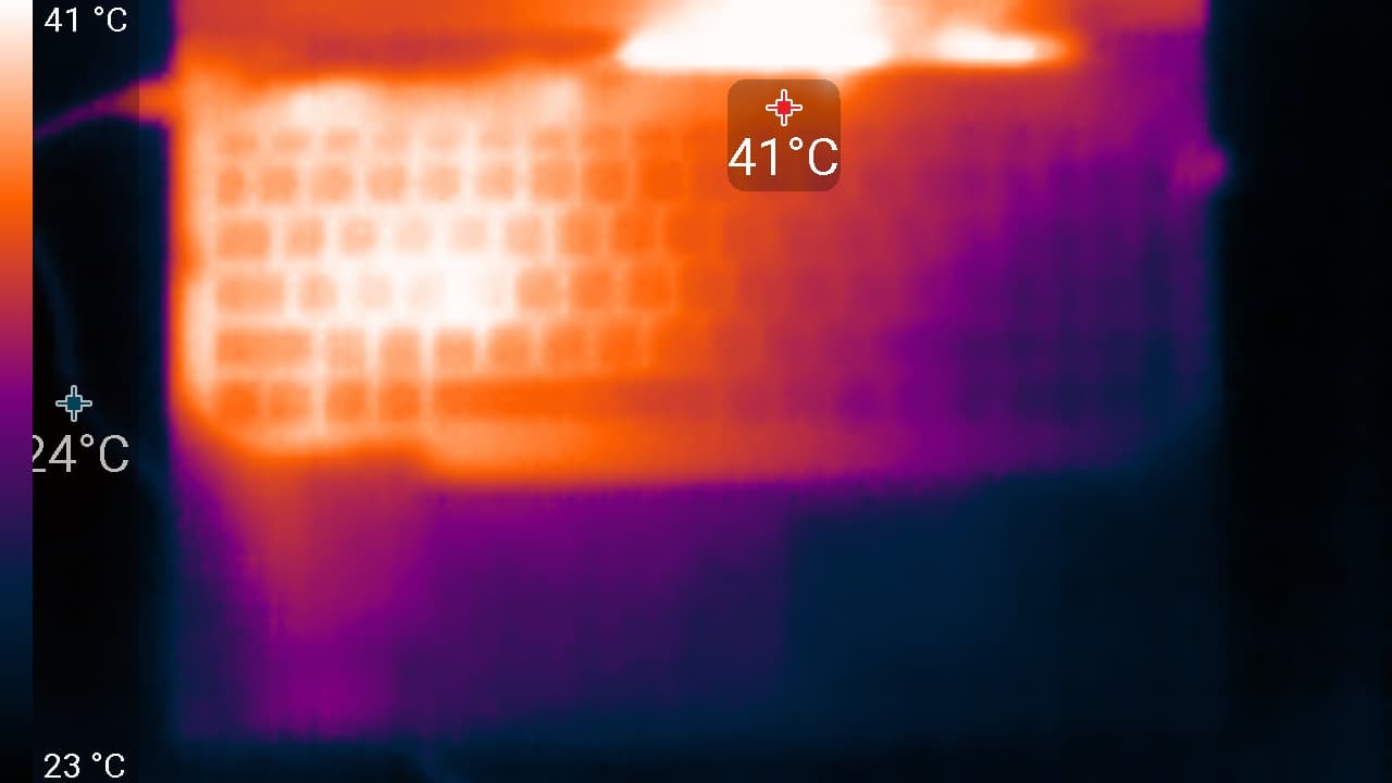 Под максимальной нагрузкой работать с клавиатурой комфортно, так как места под запястьями едва нагреваются. Держать ноутбук на коленях неприятно, так как левое колено ощущает значительный нагрев днища ноутбука (нагрев над правым также чувствуется). Блок питания греется очень сильно, поэтому при долговременной работе с большой производительностью лучше следить, чтобы он не был чем-то накрыт.