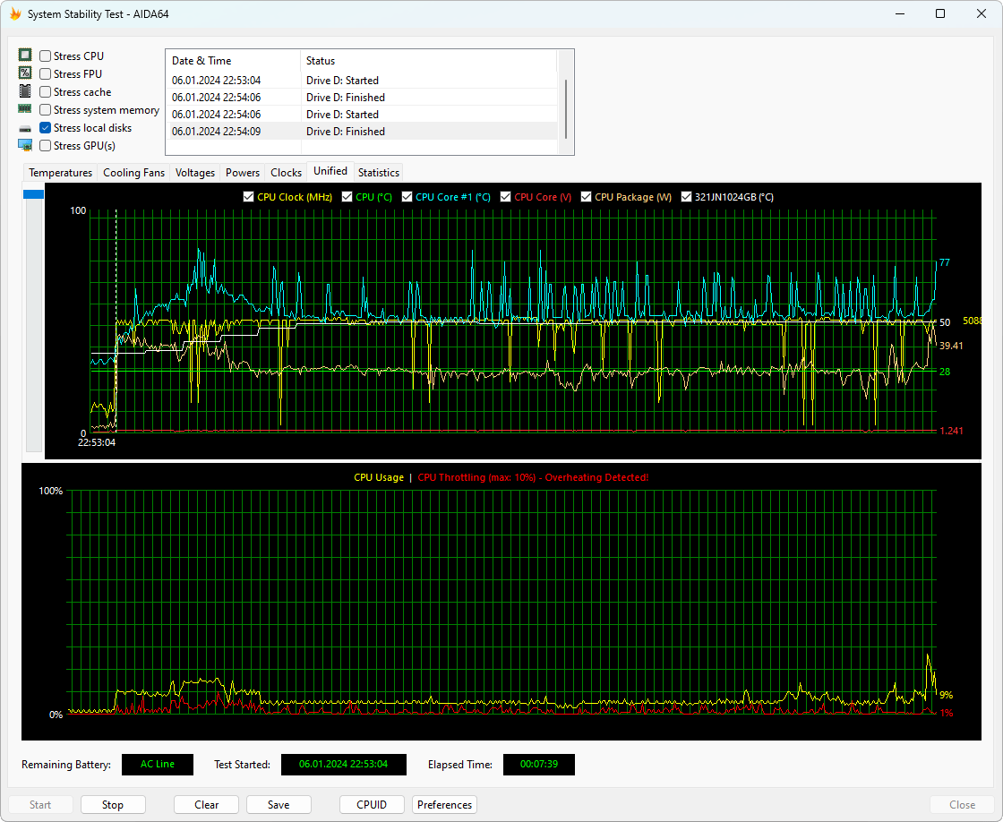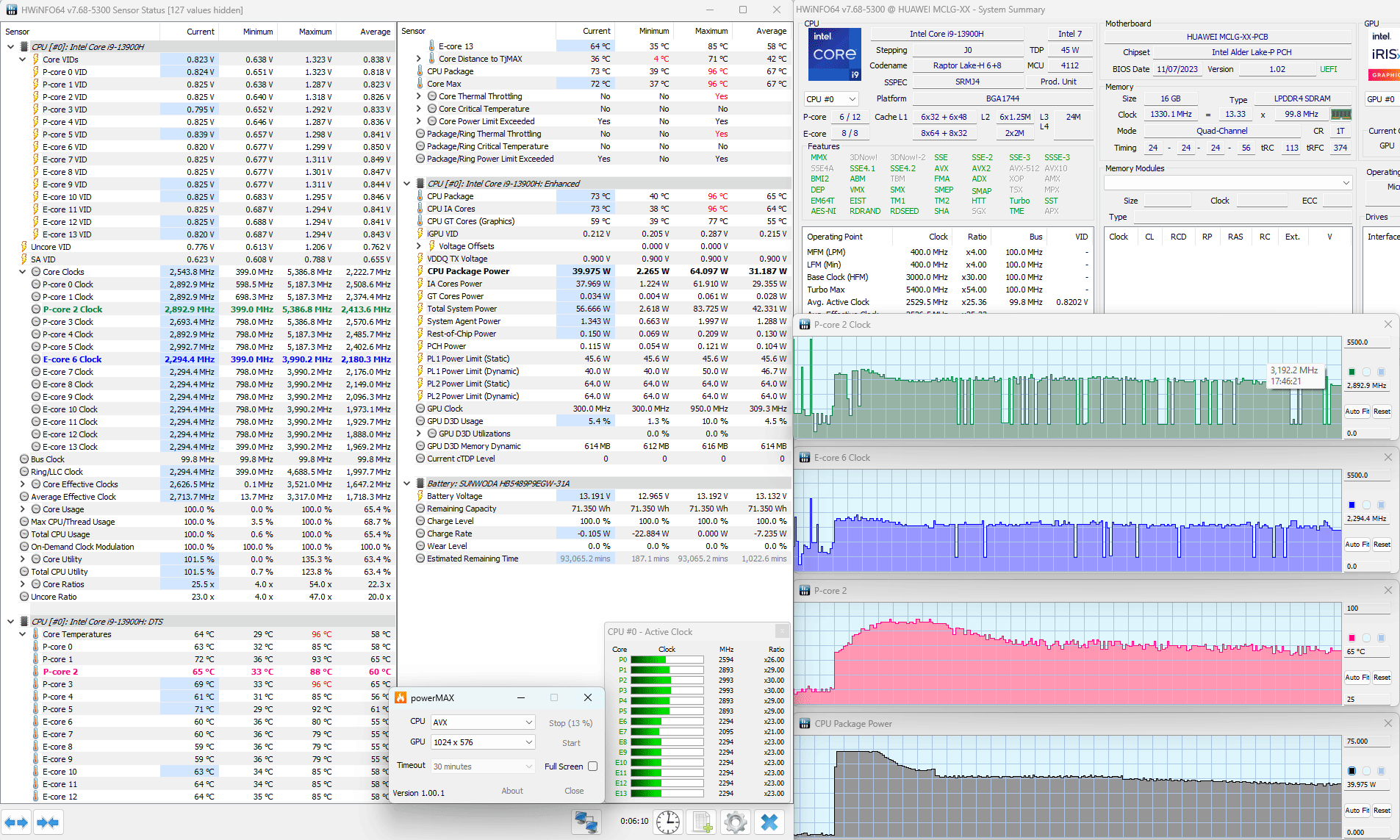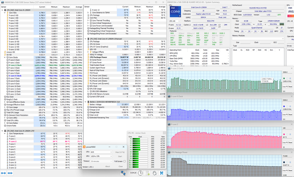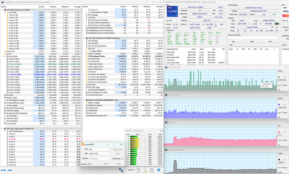 С помощью стресс-утилиты powerMax с использованием AVX-инструкций и утилиты мониторинга HWinfo64 мы протестировали Huawei MateBook D 16 2024 в двух доступных режимах при его питании от электросети. Посмотрим на полученную между ними разницу.