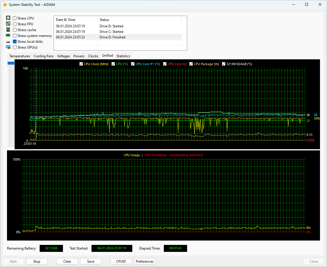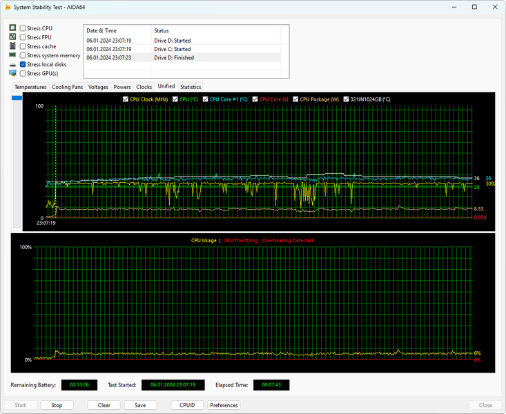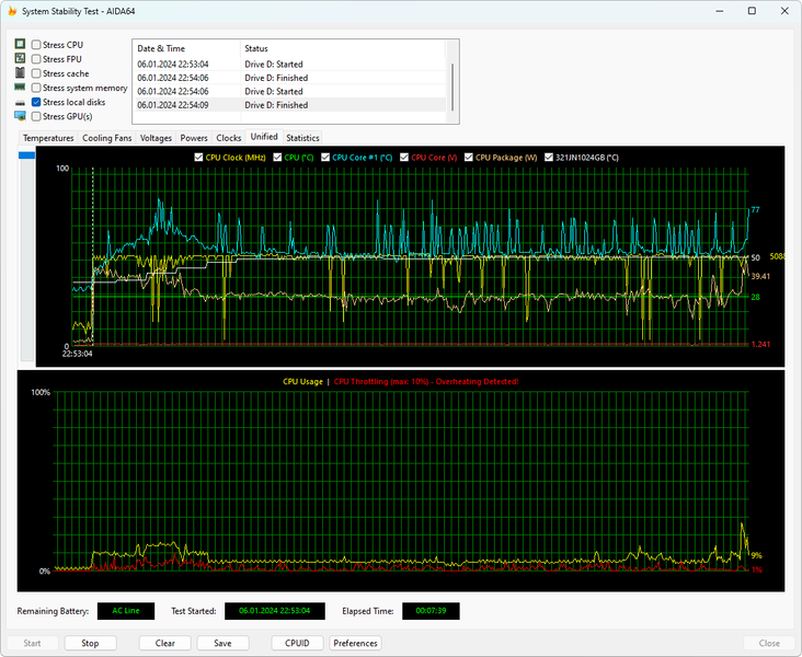 Сразу отмечаем, что перегрев и тротлинг производительных ядер процессора Core i9-13900H наблюдался в обоих режимах работы ноутбука, но в этом ничего удивительного нет, поскольку в стресс-тестах так ведет себя любой компактный ноутбук. При этом в производительном режиме частота P-ядер действительно скакнула на 5,4 ГГц в начале теста, а E-ядер до 4,0 ГГц при пиковом энергопотреблении процессора до 65 ватт. Однако уже спустя несколько минут нагрузки частоты снизились и стабилизировались на 3,2 ГГц по производительным ядрам, а также на 2,3 ГГц по энергоэффективным, а граница энергопотребления оказалась равна 40 ваттам. В сбалансированном режиме работы ноутбука алгоритм регулировки частот/напряжений/энергопотребления процессора принципиально такой же, но финальные частоты немного ниже и равны 3,0 ГГц по P-ядрам и 2,1 ГГц по E-ядрам. Уровень энергопотребления процессора после стабилизации не превышал 35 ватт. То есть, разница действительно имеет место быть. Уровень шума системы охлаждения Huawei MateBook D 16 2024 в этих режимах различается несущественно, а в целом его можно назвать комфортным.